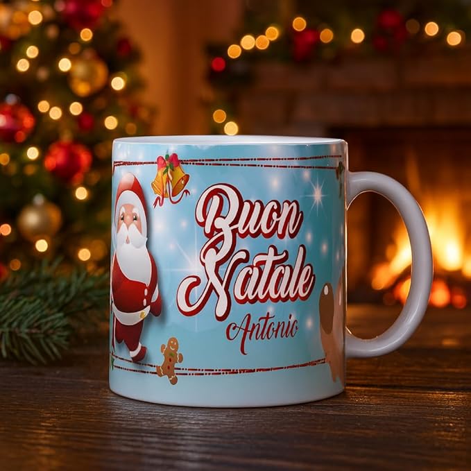 TAZZA MUG IN CERAMICA PERSONALIZZATA CON NOME FAMIGLIA DEDICA – IDEA REGALO NATALE NATALIZIA ”GIU’ DAL CAMINO”