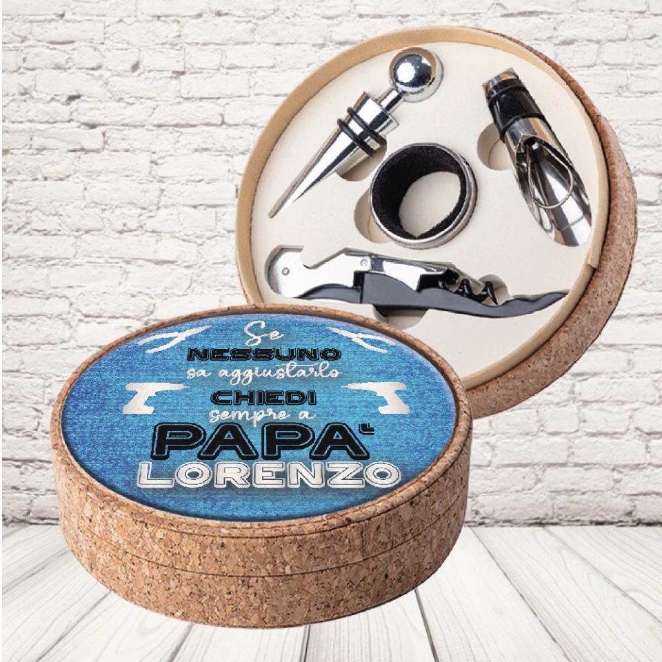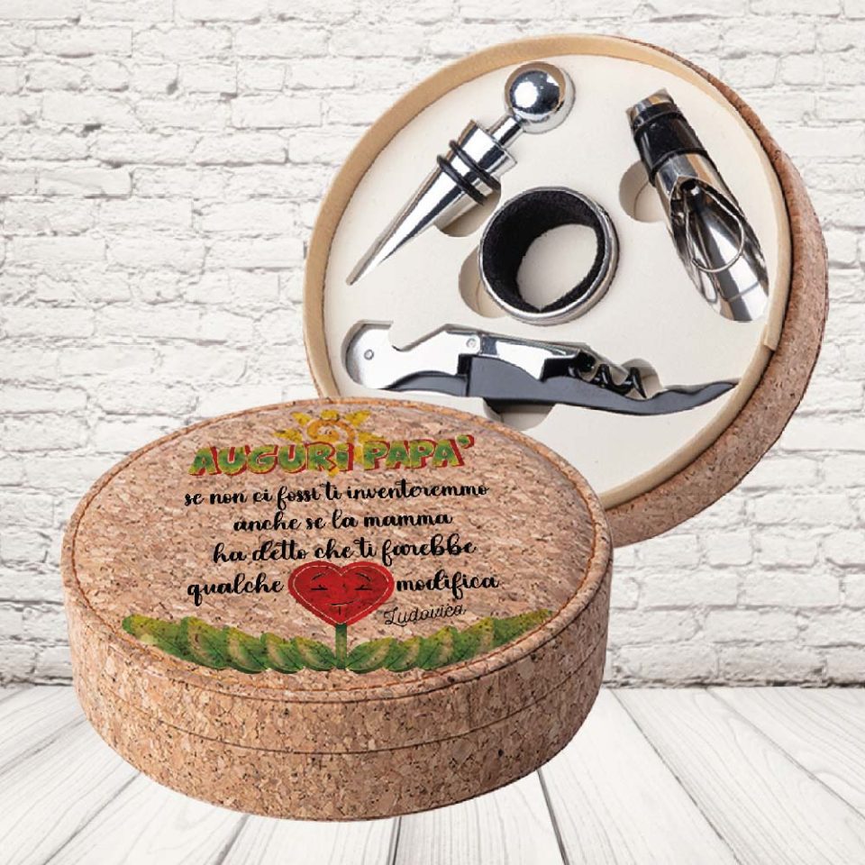 Kit Set per Vino con Accessori cavatappi Tagliacapsule Salvagoccia dosatore in Acciaio Inox in Sughero Personalizzato – Idea Regalo per Lui lei Compleanno papà ”DAD PASTELLO”