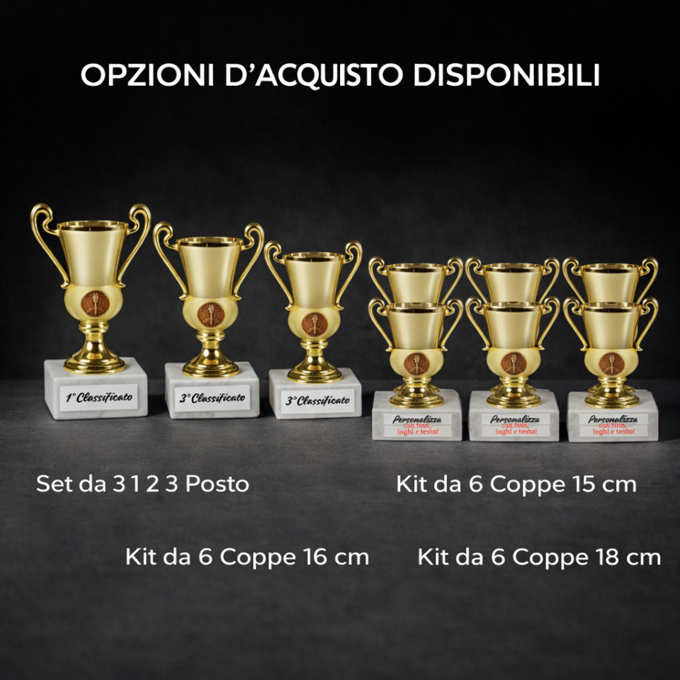 Le nostre coppe personalizzate online sono perfette per competizioni calcistiche, gare di danza, tornei, eventi scolastici e manifestazioni sportive. Puoi scegliere tra diversi modelli, dimensioni e finiture, personalizzando ogni coppa con nome evento, data, logo o dedica. Le coppe su misura sono ideali per chi cerca un premio elegante, professionale e rappresentativo.