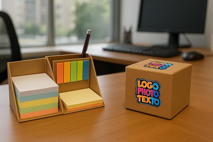 Kit Set 20pz da Scrivania blocco cubo Appunti Ecologico Portapenne con foglietti adesivi e Segna Pagine Personalizzabile con Logo testo Idea Regalo per Aziende Uffici Lavoro