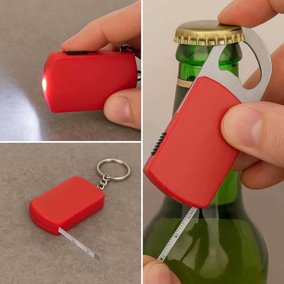 Kit set 25, 50 o 100 pezzi Portachiavi Multiuso con Luce Led, Apri Bottiglie e Metro, Personalizzabile Con Foto, Logo, Testo