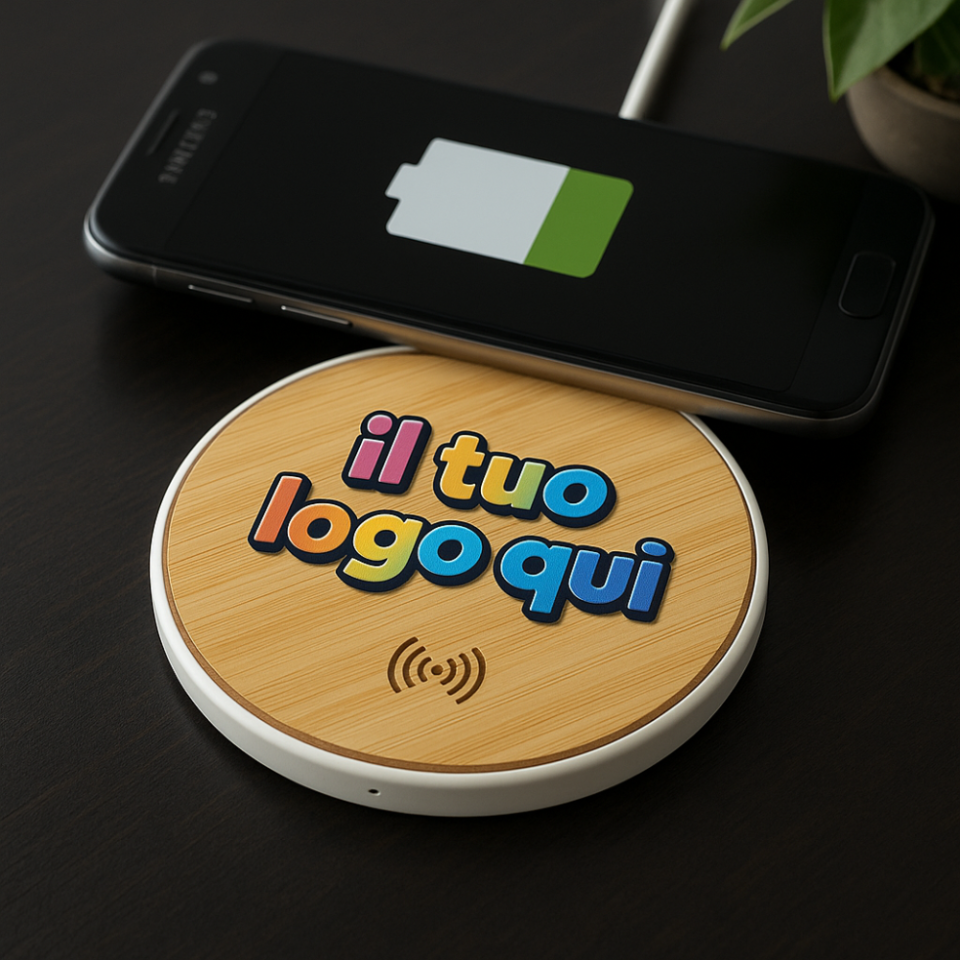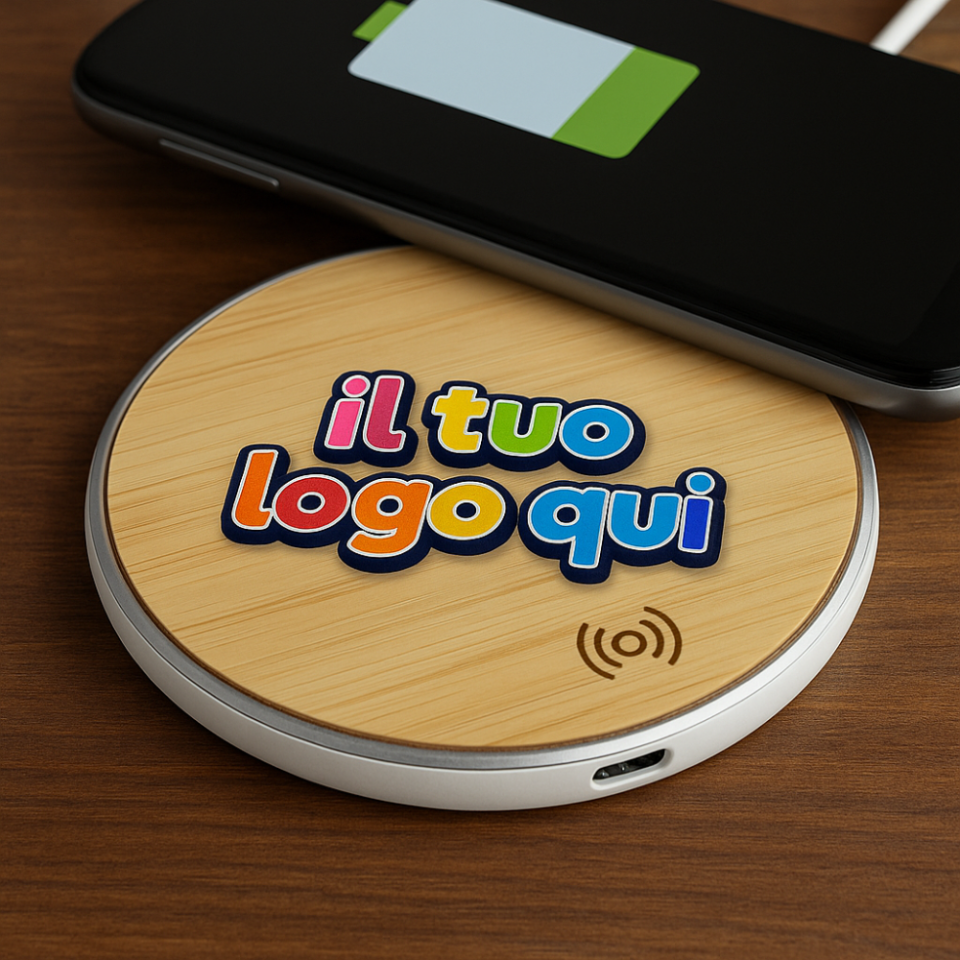 Kit 25 50 Caricatore Base in Bamboo Pad Ricarica Wireless Personalizzato con Logo Testo Caricabatterie per smartphone Universale – Gadget Personalizzato Aziendale Pubblicitario
