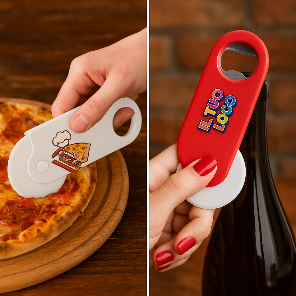 Kit Set 50 Rotella Taglia Pizza con Apribottiglie Personalizzata con Logo Scritte Foto Idea Regalo Bomboniera Gadget Aziendale Promozionale