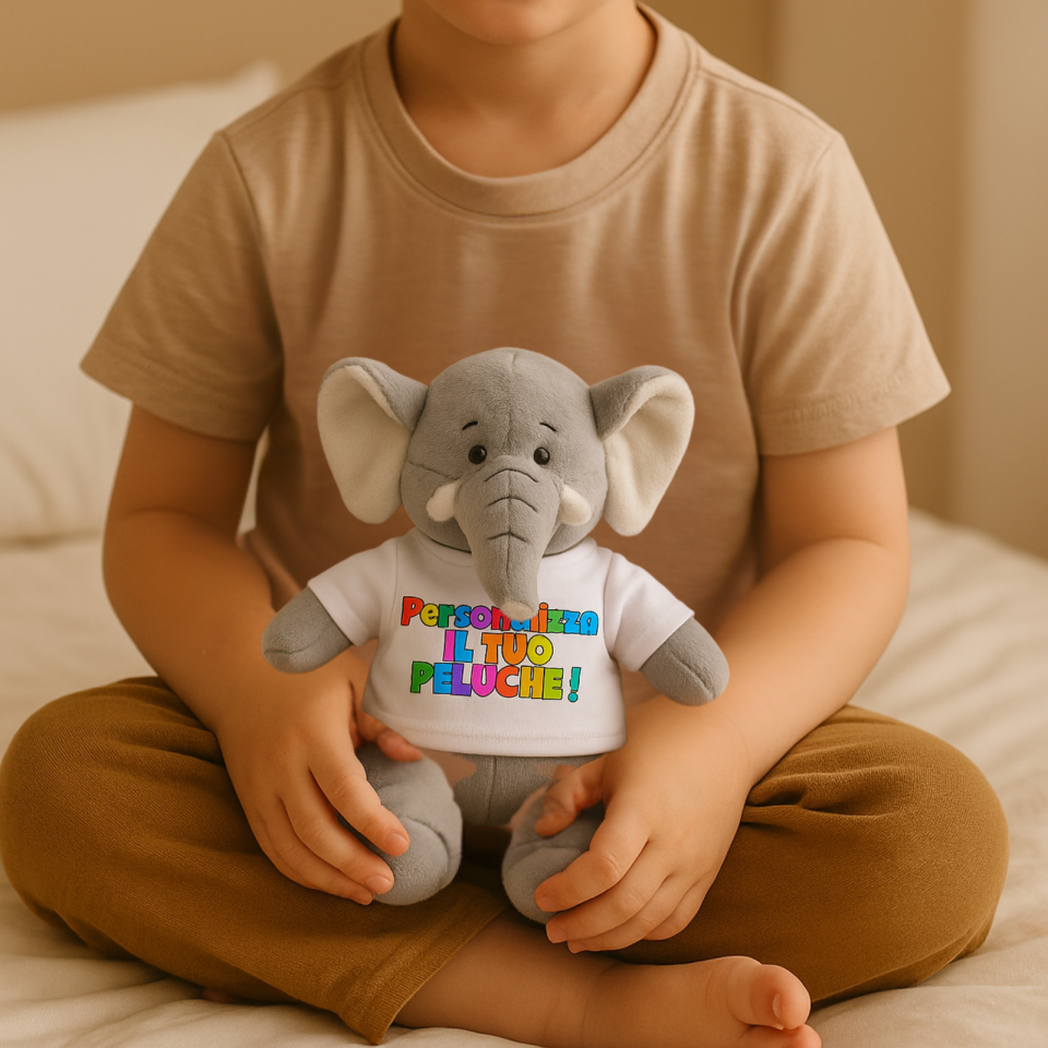 Morbido Peluche Elefantino Personalizzato con Foto e testo – Pupazzo Elefante con t-shirt bianca personalizzabile – Idea Regalo per San Valentino Natale Festa della Mamma o Papà Compleanno