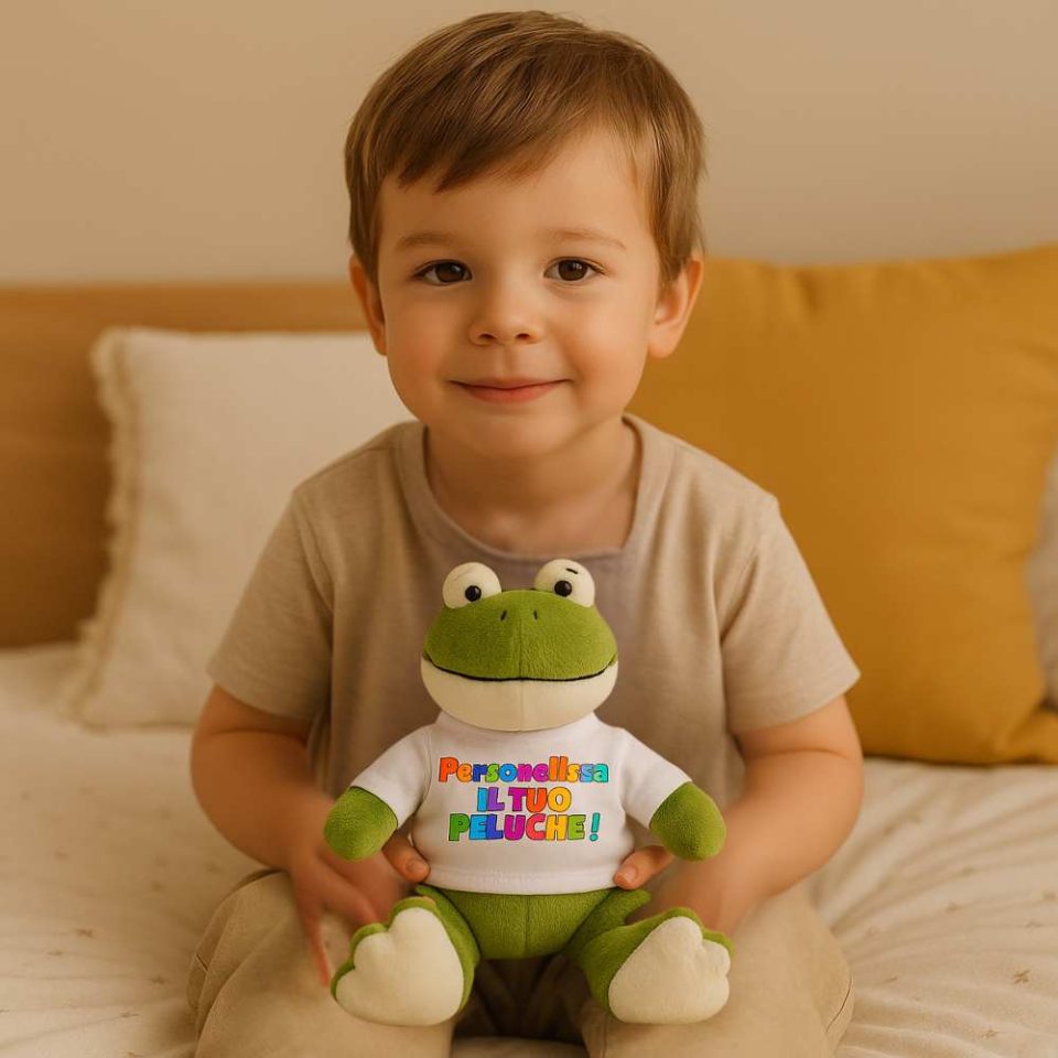 Morbido Peluche Ranocchio Personalizzato con Foto e testo – Pupazzo Rana con t-shirt bianca personalizzabile – Idea Regalo per San Valentino Natale Festa della Mamma o Papà Compleanno