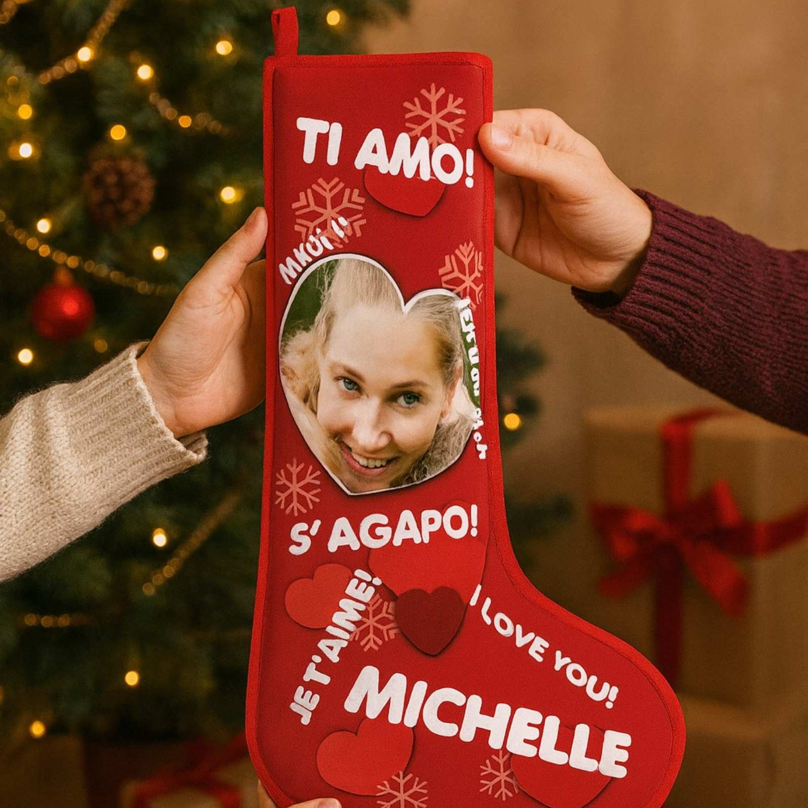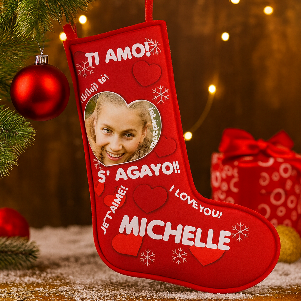 Calza Personalizzata della befana Ti Amo in Tutte Le Lingue con Nome e Foto per Natale ed Epifania