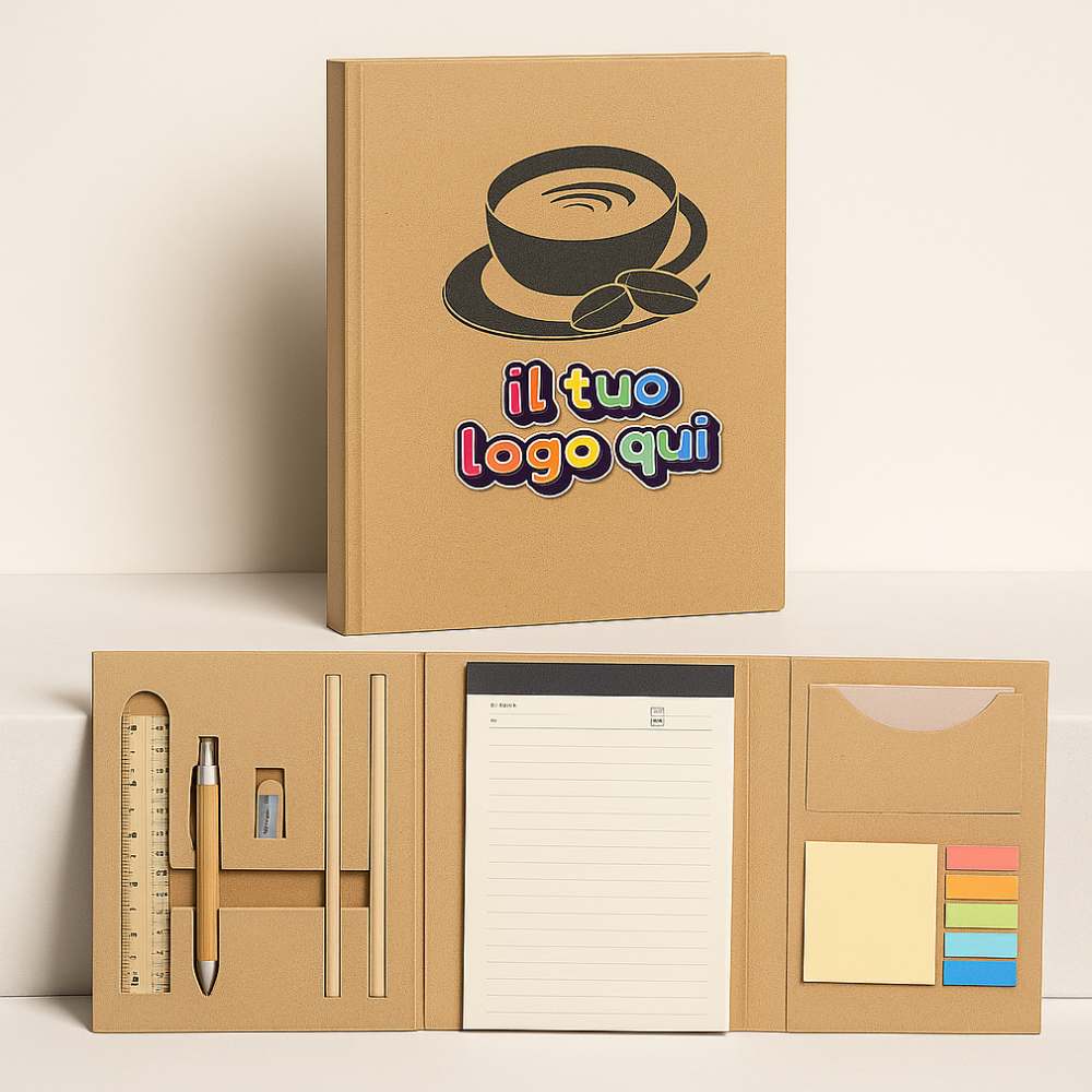 Cartellina Quaderno Blocco Appunti con Penna e Foglietti Adesivi Personalizzabile con Logo e Testo – Blocco Note Premium con Accessori – Gadget aziendale pubblicitario per Scuola e Ufficio