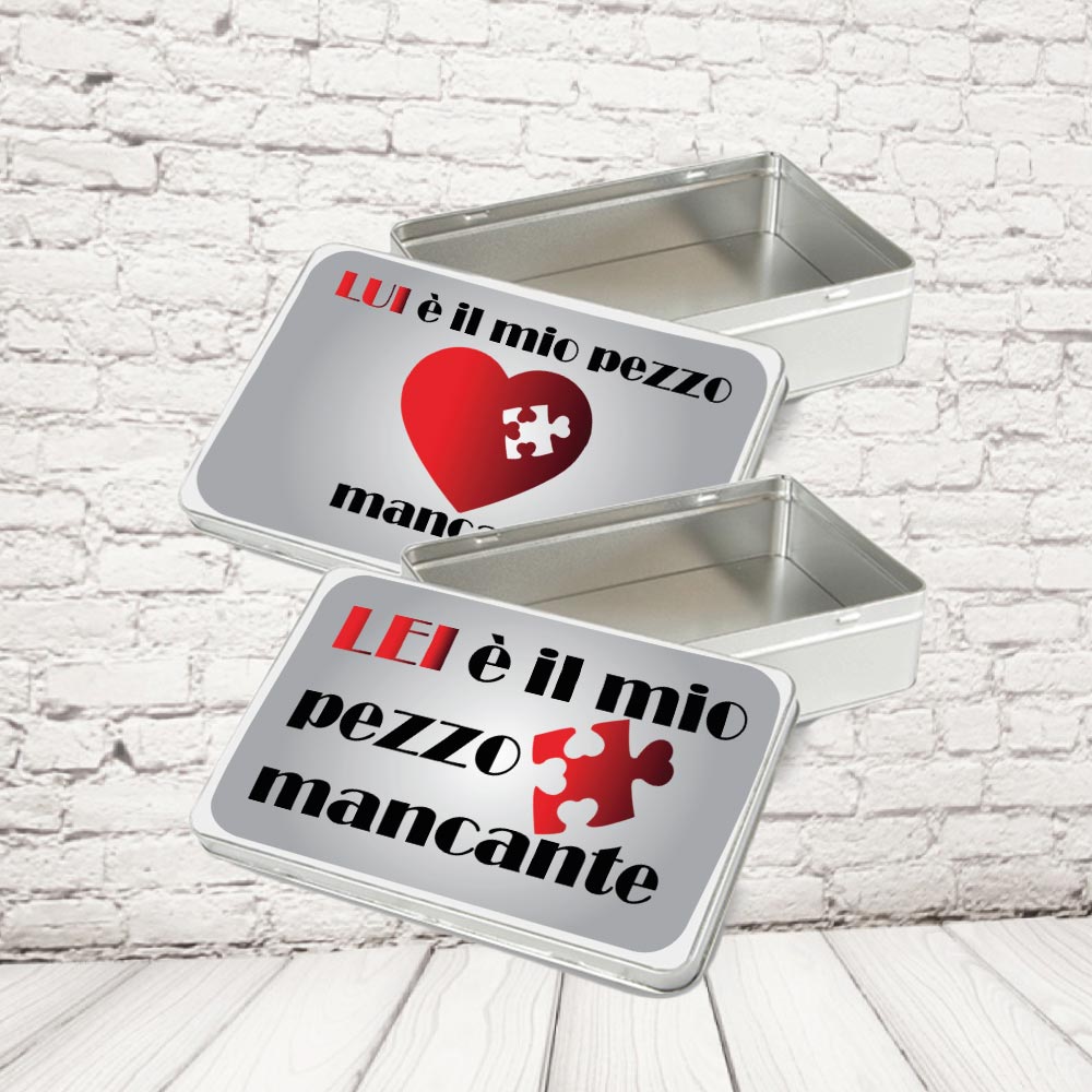 Coppia Scatoline in Latta Porta Gioie Per Lui e Lei ”PEZZO MANCANTE” Divertenti Personalizzate con Nome Idea Regalo Fidanzati Amore Love Sanvalentino Anniversario Sposo Sposa