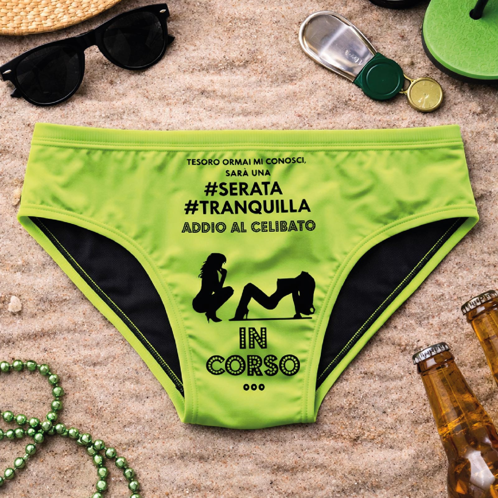 Costume Slip da Mare per Addio al Celibato ”SERATA TRANQUILLA” Uomo Sposo, Grafica Divertente, Giallo o Verde Fluo, Gadget Originale per Festa Addio al Celibato