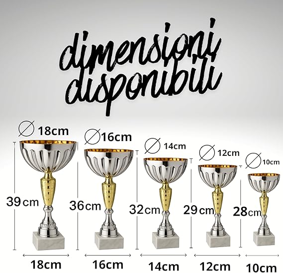 - DIMENSIONI COMPLETE: trofei disponibili in 5 misure diverse, da 39 cm a 28 cm di altezza, con basi da 18 cm a 10 cm di larghezza