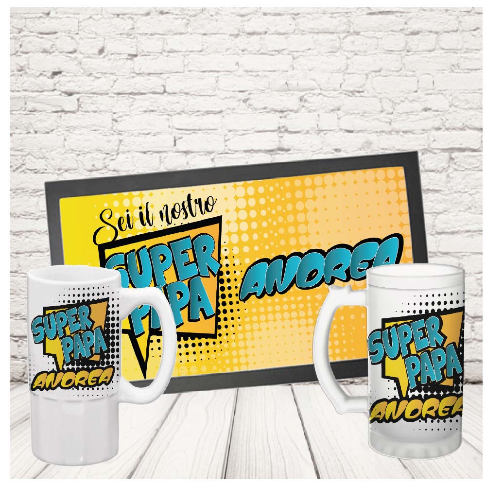 Kit Barman COPPIA TAPPETINO per BANCONE da BAR PIÙ BOCCALE ”COMICS DAD“ Bicchiere BIRRA IN CERAMICA O VETRO SATINATO PERSONALIZZABILE idea regalo per Papà