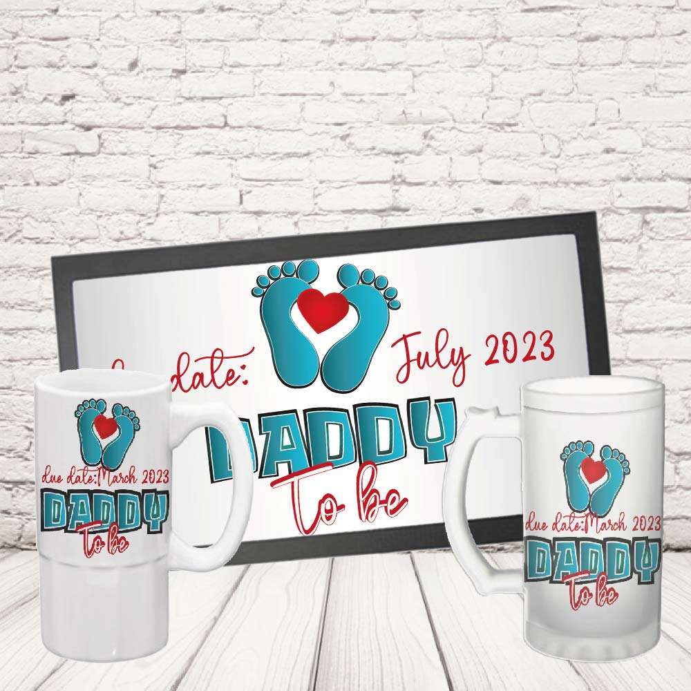 Kit Barman COPPIA TAPPETINO per BANCONE da BAR PIÙ BOCCALE ”DADDY TO BE“ Bicchiere BIRRA IN CERAMICA O VETRO SATINATO PERSONALIZZABILE idea regalo per Papà