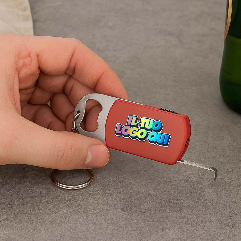 - Pratico Kit Multiuso: Questo portachiavi compatto combina un metro a nastro , un apribottiglie e una luce LED, rendendolo uno strumento versatile da avere sempre con sé.