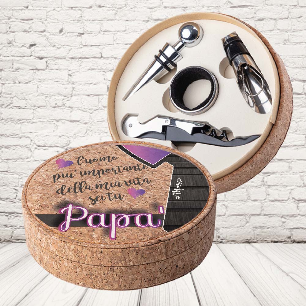 Kit Set per Vino con Accessori cavatappi Tagliacapsule Salvagoccia dosatore in Acciaio Inox in Sughero Personalizzato – Idea Regalo per Lui lei Compleanno papร  ”DAD CRAVATTA”