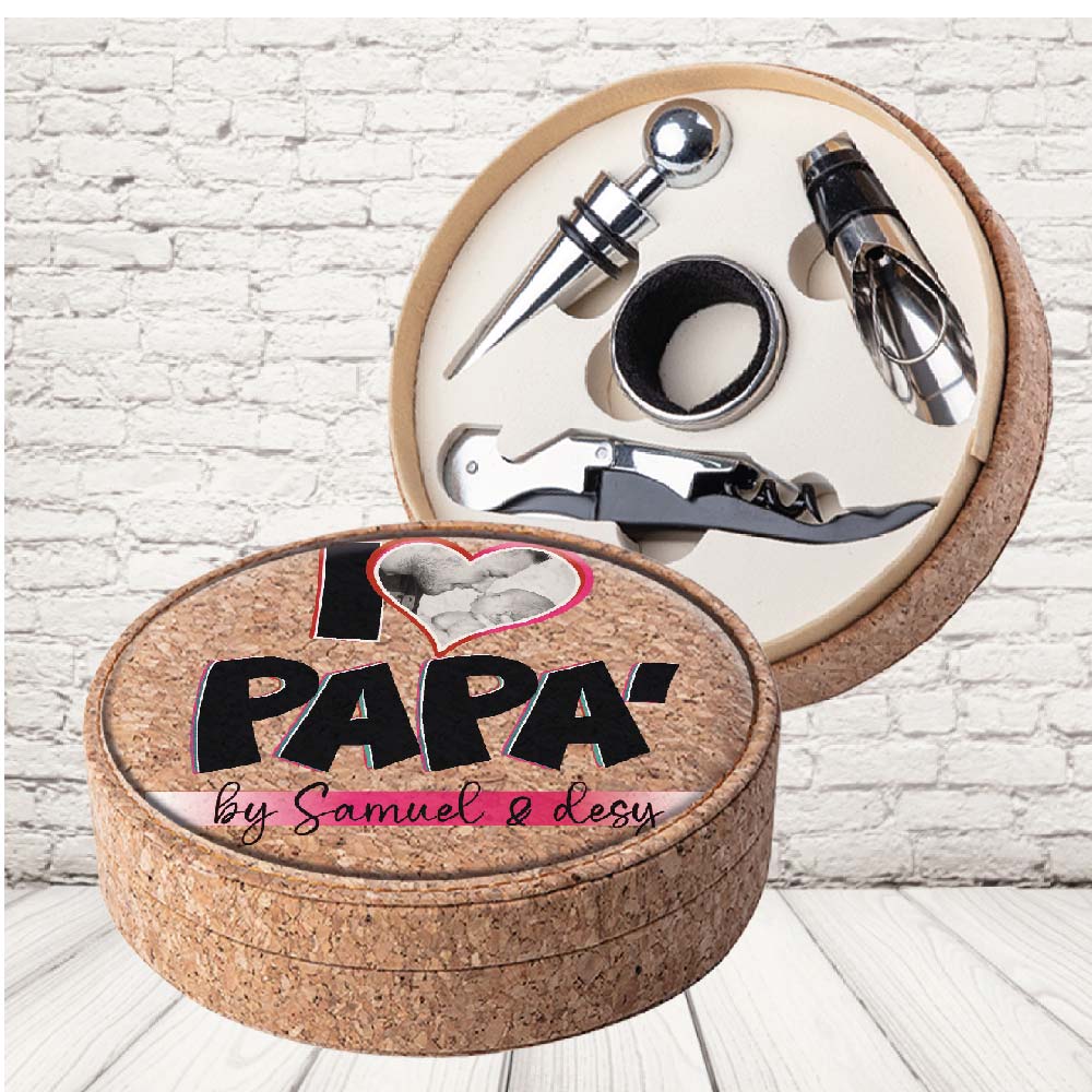 Kit Set per Vino con Accessori cavatappi Tagliacapsule Salvagoccia dosatore in Acciaio Inox in Sughero Personalizzato – Idea Regalo per Lui lei Compleanno papร  ”I LOVE DAD ROSA”