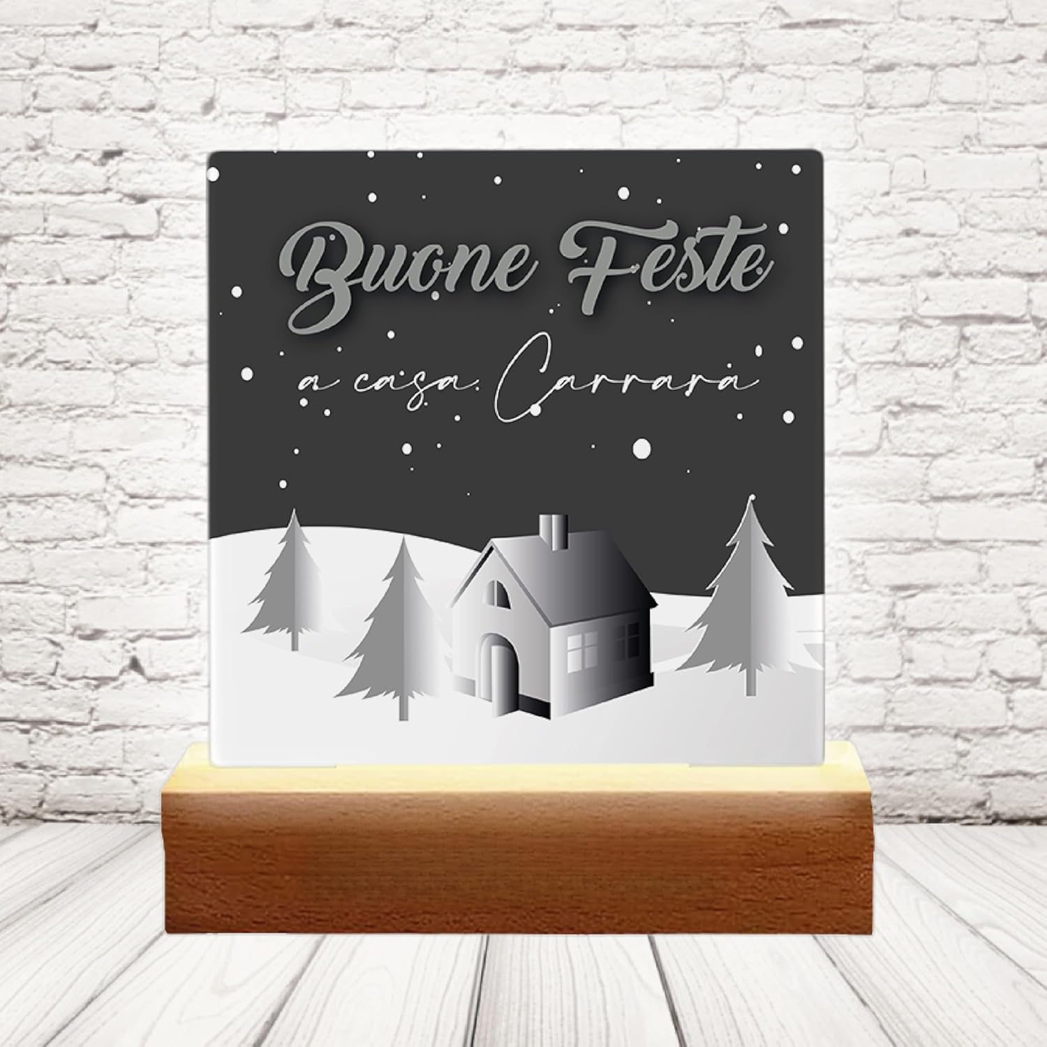 Lampada Led in Plexiglass da Tavolo Scrivania Personalizzata con Nome Famiglia, Idea Regalo Per Natale Natalizia ”NEVE ALLA PORTA”