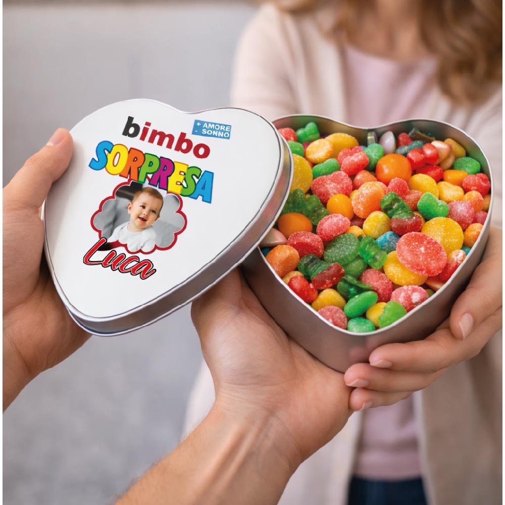 • Scatola cuore personalizzata con foto e nome – Rendi unico il tuo regalo con la foto del bambino e il suo nome stampati sul coperchio.