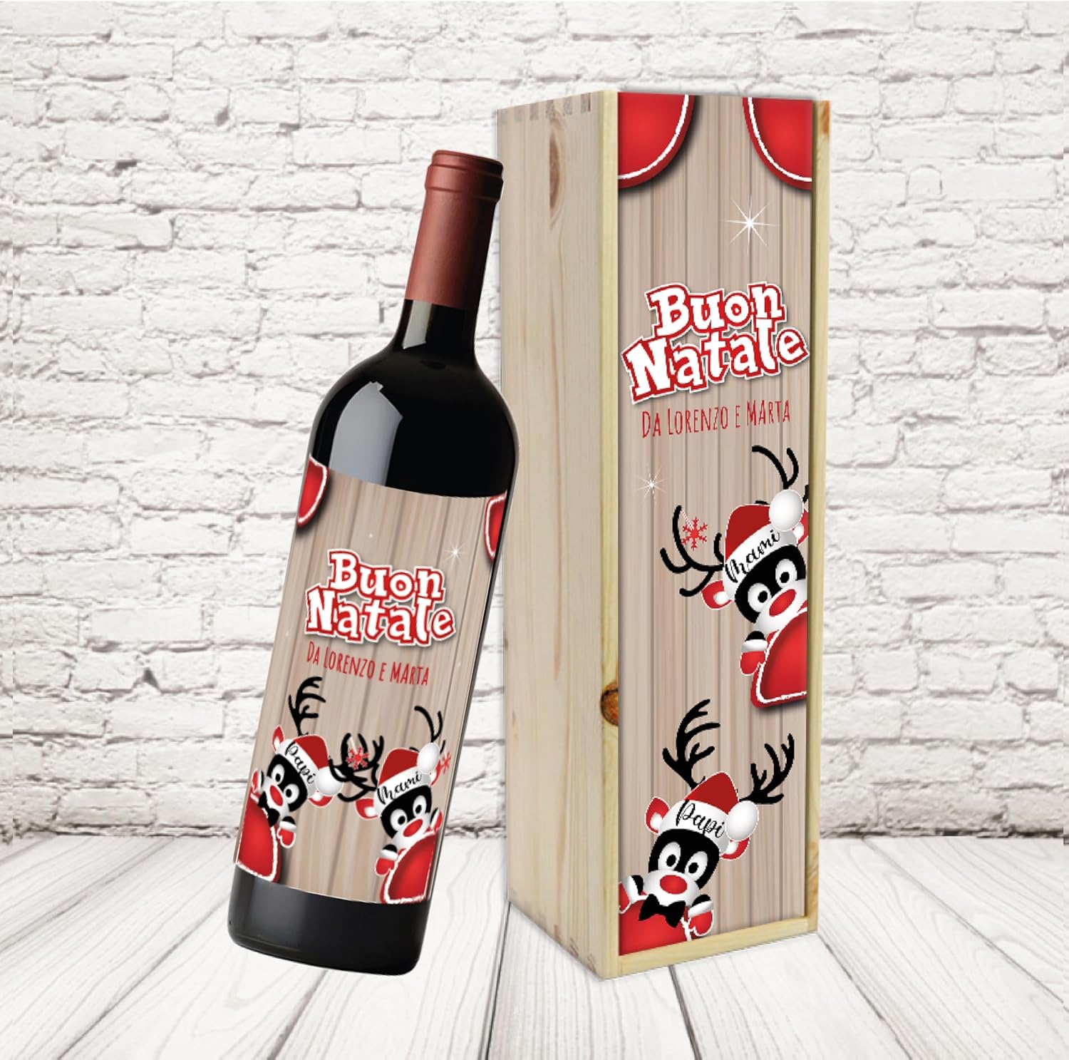 Scatola Box Porta bottiglie in Legno per Vino Cassetta con Etichetta Personalizzata Famiglia – IDEA REGALO NATALE NATALIZIA ”RENNE CHRISTMAS”